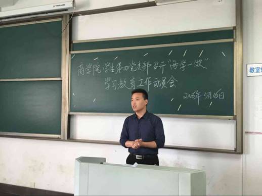 5月16日下午,商学院各学生党支部全体党员(含预备党员)在汇文楼三楼教室分别召开“两学一做”学习教育动员部署会,贯彻落实中共中央办公厅《关于在全体党员中开展“学党章党规、学系列讲话,做合格党员”学习教育方案》及《安徽工业大学关于在全校党员中开展“两学一做”学习教育实施方案》、《商学院学生党支部“两学一做”学习教育实施方案》的要求,会议由各学生党支部书记主持。