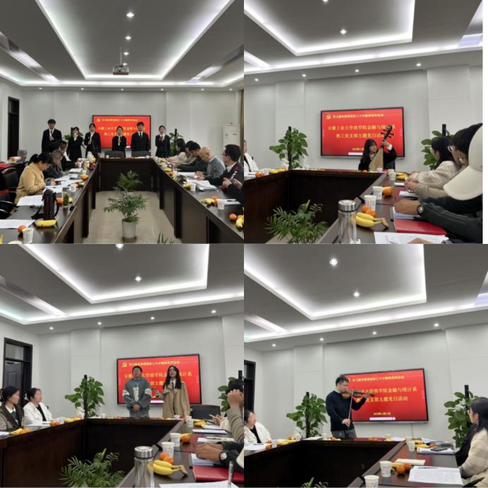 活动在嘹亮的国歌声中拉开帷幕。金融与统计系党支部书记吴义东带领全体与会党员同志面向党旗,重温入党誓词。学生代表冯佳琪、崔露允、张世成、雷祝祥、朱菲、朱一炜集体朗诵《中国力量》,声情并茂地展示了中国过去五年的发展成就和新时代十年的伟大变革,慷慨激昂,催人奋进。随后,吴义东领学党的二十大报告、《中共中央关于认真学习宣传贯彻党的二十大精神的决定》《党的二十大报告学习辅导百问》《二十大党章修正案学习问答》等材料,结合在党的二十大精神马鞍山市直宣讲团集体备课会中的学习体会,通过读原文、学原著、悟原理,全面准确深刻阐释党的二十大精神。学生代表詹苏卉表演琵琶节目《唱支山歌给党听》;陈婧雯、龚志伟同学歌唱节目《强军战歌》,通过曲艺和歌声,深情表达了永远感党恩、听党话、跟党走的坚定决心,深情诠释了有党才有国、强国须强军的历史必然。与会党员同志同党外人士围绕党的二十大报告及相关读本,结合自身的工作、科研、学习、生活、成长历程,深入阐述了学习心得体会,讨论氛围热烈。艺术与设计学院青年海归教师王章通过理论讲述和小提琴独奏的方式,依次演奏了《梁祝》《花儿为什么这样红》《丰收渔歌》《春节序曲》《渔舟唱晚》《我和我的祖国》《灯火里的中国》等中华优秀文艺曲目,增强了与会师生对中华优秀传统文化的认知和自信,把中华民族的伟大时代变迁和深厚家国情怀融入到一个个动人旋律中,将现场气氛一次次推向高潮。最后,吴义东对本次活动作了总结,强调学习宣传贯彻党的二十大精神是当前和今后一个时期全党全国的首要政治任务,大家必须坚持全面、准确、深入理解内涵,精准把握外延,对照原文原著,逐字逐句认真学反复学,学深悟透,学懂弄通,内化于心,外化于行;对与会师生代表特别是通过才艺展示等方式抒发爱党爱国爱军情怀的受邀嘉宾表达了感谢。