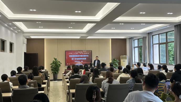 根据院党委政治理论学习安排,10月14日,商学院在汇文楼B204会议室开展党的二十届三中全会精神宣讲活动。本次宣讲由马克思主义学院毕圣海老师主讲,中心组成员、各支部书记、支委成员、党员代表参加学习。