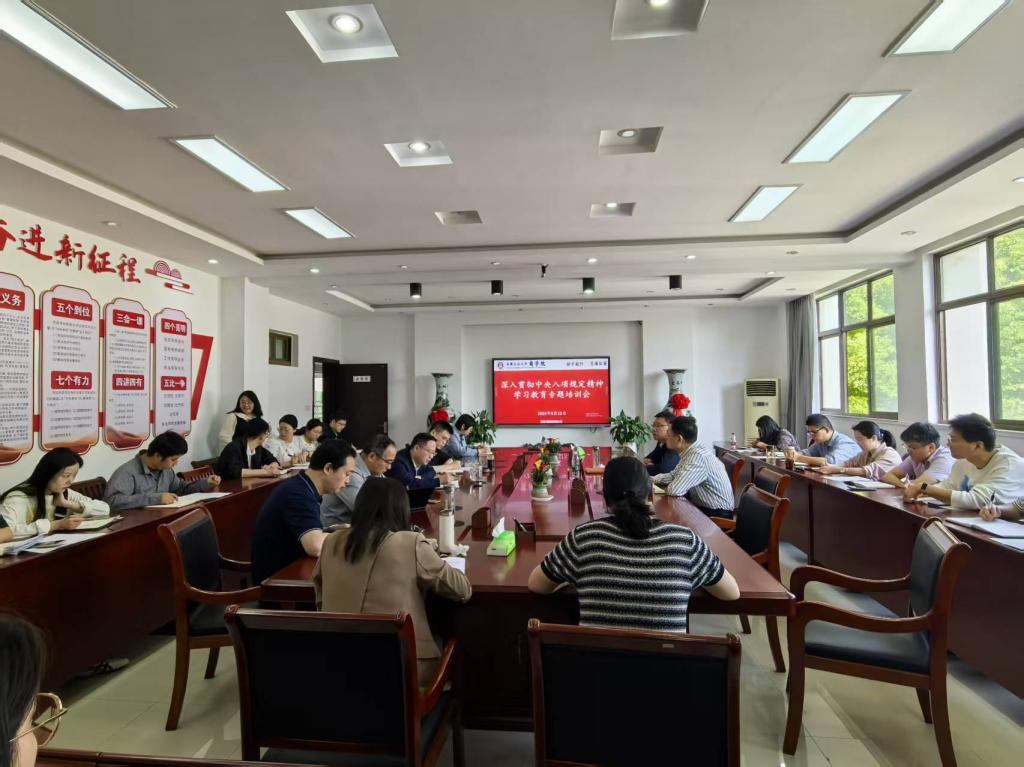 5月12日,商学院举办深入贯彻中央八项规定精神学习教育专题培训。院党委书记杜飞作专题党课,院党委副书记、纪委书记、副院长蒋磊作警示教育。学院领导班子成员、年轻干部、关键岗位干部等40余人参加培训。