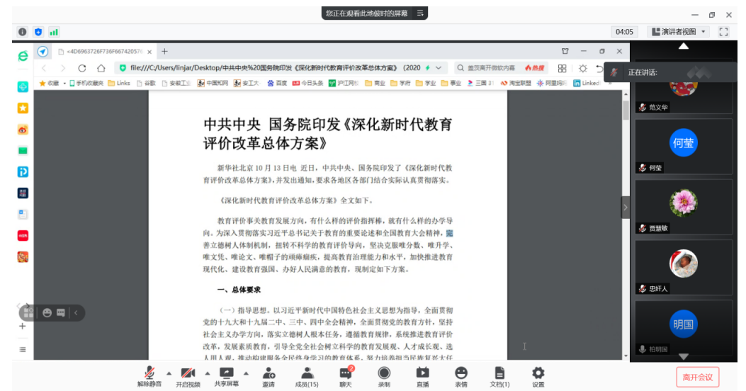 为深入贯彻落实习近平总书记关于教育的重要论述以及全国教育大会精神,坚持社会主义办学方向,落实立德树人根本任务,5月15日至17日,商学院会计系、工商管理系、市场营销系、经济系、金融与统计系以及国际贸易系等六个系通过线上或线下集中的方式,组织学习了《深化新时代教育评价改革总体方案》。