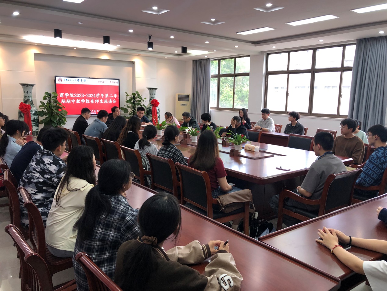 5月27日下午,商学院在汇文楼B304会议室召开了2023-2024学年第二学期期中教学检查师生座谈会。院党委副书记、副院长蒋磊、副院长刘艳华以及各系主任、辅导员代表、教学干事和各年级学生代表参加了本次座谈会。座谈会由刘艳华主持。