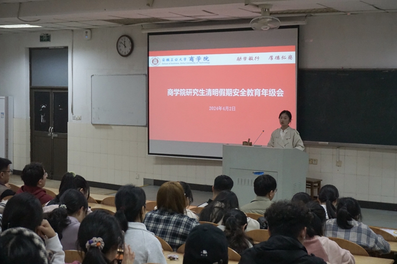 4月2日晚上,商学院在秀山校区东教一阶101召开研究生清明假期安全教育年级会,研究生辅导员和各年级研究生参加了此次会议。会议由辅导员郝乐老师主持。