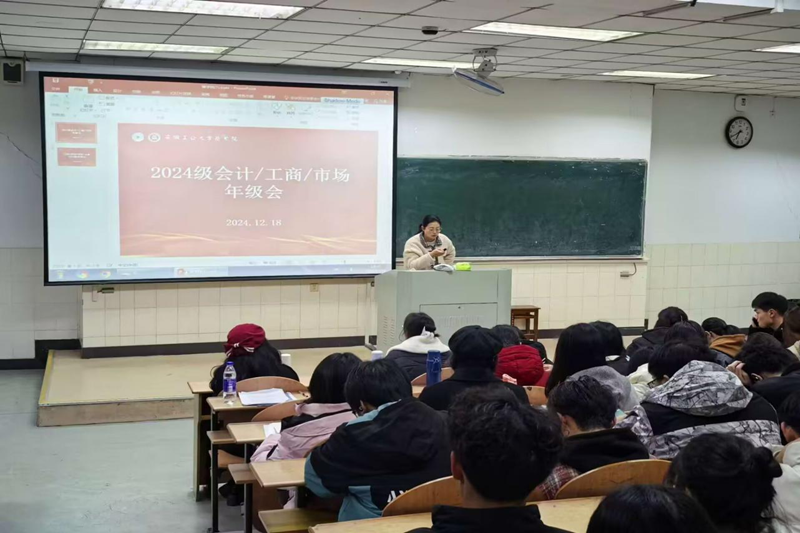 为加强师生交流,引导学生思想,促进学生个人成长与发展,12月18日晚,我院于阶教103举办2024级新生年级会。会议邀请商学院党委副书记、纪委书记、副院长蒋磊担任主讲人。
