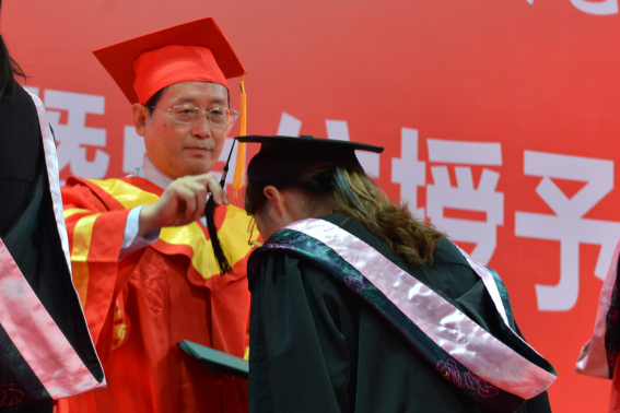 出席典礼领导和导师代表为毕业生逐一扶苏正冠,行拨穗礼,颁发证书,并合影留念。