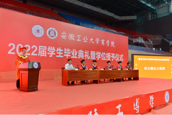 毕业典礼在雄伟庄严的国歌声中拉开序幕。魏先文在致辞中首先向2022届毕业生们表示祝贺,向为学生成长成才努力奉献、辛勤付出的老师、家长表示感谢。他肯定了2022届毕业生在校期间取得的累累硕果,并对他们提出三点殷切希望:一要传承商科精神,践行经世济民。在未来的道路上将理论与实践相结合,践行经世济民理念,以真才实学服务人民、奉献国家。二要始终心怀梦想,矢志创新实干。传承安工大精神,踏实努力,勇于探索,敢于创新,追求卓越,艰苦奋斗,以实际行动践行“请党放心、强国有我”的青春誓言。三要坚持崇德修身,涵养家国情怀。勇立时代潮头,做有为青年,对自己、家庭、母校、社会、国家尽责,与时代共同成长。他表示,希望毕业生们满怀自信地步入社会,奔赴新的岗位,欢迎大家常回家看看,并表达了美好的祝愿。