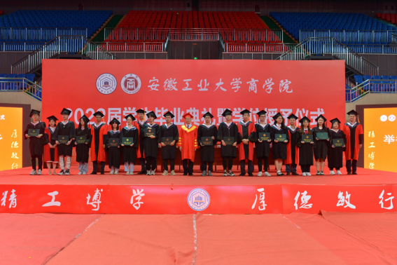 院长章铁生宣读了2022年安徽省普通高等学校品学兼优毕业生、校优秀毕业生及校友联络员名单,在主席台就座的领导为获奖学生颁发了荣誉证书,为校友联络员颁发了聘书。