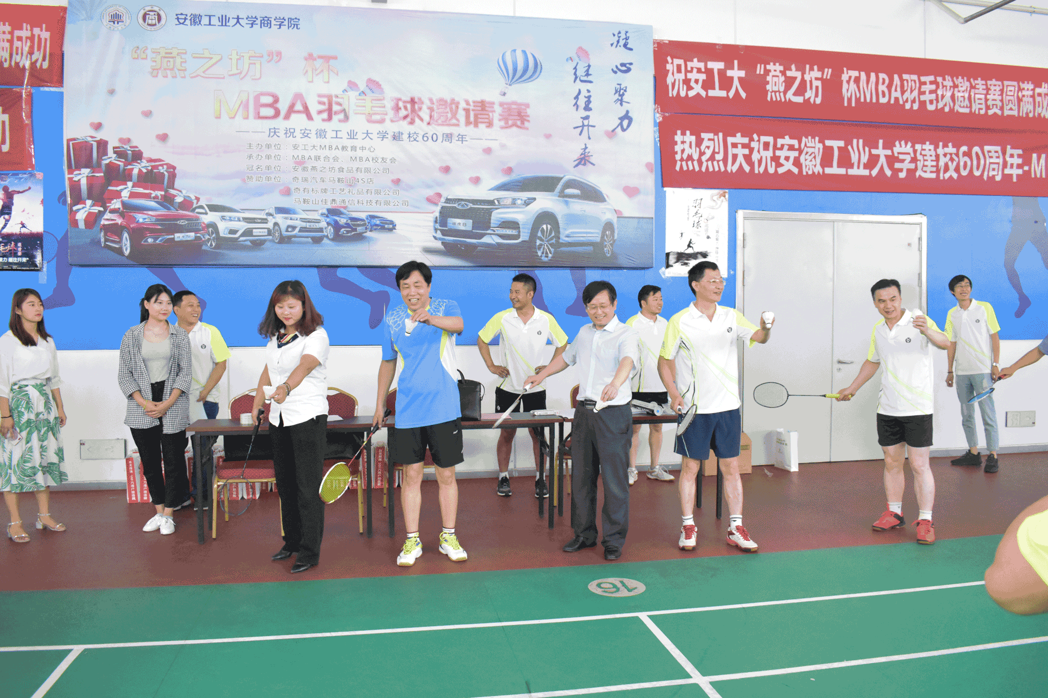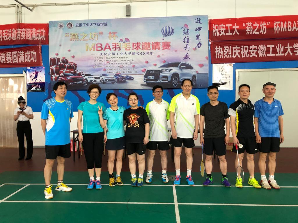 为迎接安徽工业大学60周年校庆,传承文化底蕴,弘扬优良传统,展示办学成就,扩大社会影响,MBA教育中心以羽毛球邀请赛为载体,凝聚校友力量,丰富师生业余生活,促进MBA学员和学员单位之间广泛交流,现由MBA教育中心主办,MBA校友会&MBA联合会共同承办“凝心聚力继往开来”“燕之坊”杯MBA羽毛球邀请赛,比赛于2018年6月24日在奥体爱玛会羽毛球馆(安工大东校区)举行,应邀参加本次比赛的十支队伍分别是安徽MBA代表队,安工大教工代表队,SKrBT