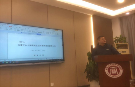 李伟军首先带领大家学习了《安徽工业大学研究生指导教师岗位管理办法》,进一步明确研究生导师岗位职责要求:导师是研究生培养的第一责任人,应具备良好的道德品质、严谨的治学态度和较高的学术水准,在政治素质、思想品德、学习科研、心理健康等方面全面关心研究生的成长,帮助研究生树立严谨的治学态度和高尚的职业道德;及时将本学科的最新研究成果融入教学内容,创新教学模式,丰富教学手段。同时,要加强实验室管理,对研究生进行实验室安全教育,增强研究生实验安全意识;关注研究生就业,引导学生树立正确的就业观,指导学生做好职业生涯规划,真心关爱学生,及时掌握学生的学习、生活和工作情况。