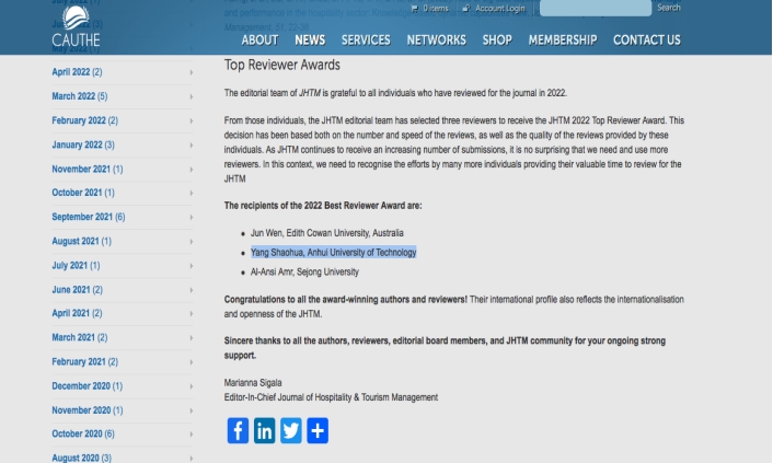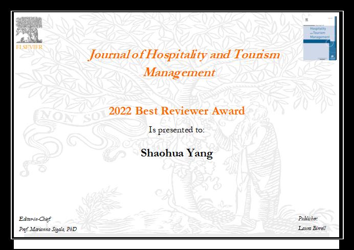 杨少华副教授荣获2022年《Journal of Hospitality and Tourism Management》期刊最佳审稿专家荣誉。该评选根据审稿专家评审报告的质量,数量以及评审速度来综合考核,经全球编委会成员提名和讨论决定,本次全球共3位学者获此荣誉。杨少华博士是入选该期刊2022年度最佳审稿专家的三位学者之一,也是迄今为止唯一一位以中国大陆大学为署名单位的最佳审稿专家。