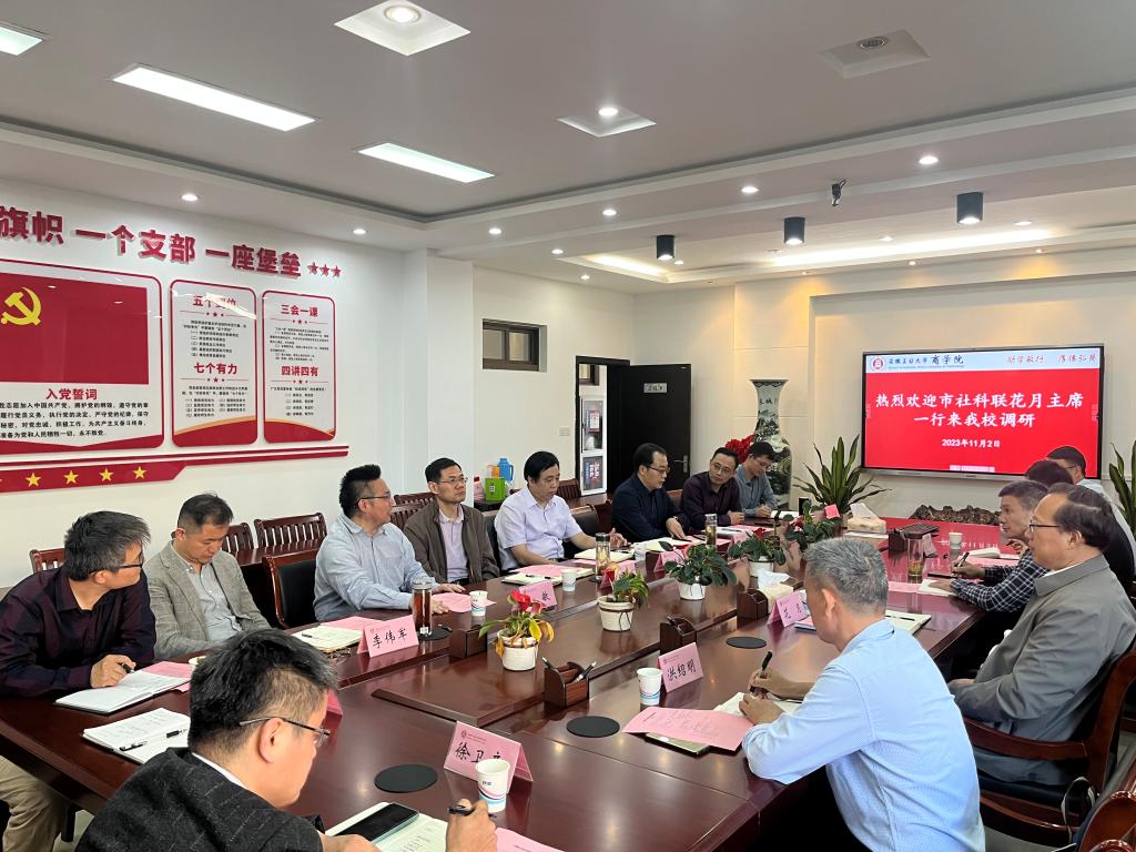 11月3日下午,市委宣传部副部长、市社科联主席花月,市社科联三级调研员张跃武,市经济学会会长洪绍明,市社科联办公室副主任王明银等一行来校调研智库建设工作。科研处、人力资源处、SKrBT