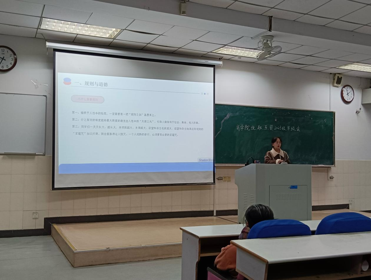在东阶102教室召开“遵规守纪,诚信做人”主题年级会。会议由辅导员老师钱龙梁、肖梦雨、张舒主讲,大一全体新生参与。