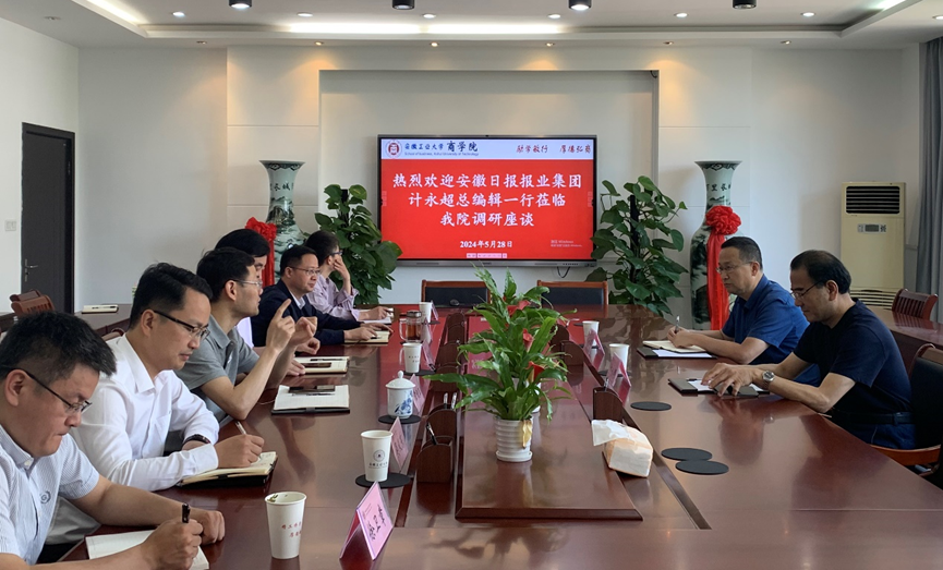 章铁生代表学院对计永超一行表示热烈欢迎,对安徽日报长期以来的支持和帮助表达了谢意,并从学科建设、师资力量、科研成果、智库平台等方面简要介绍了基本院情。最后,章铁生表示,学院会非常重视开展这项合作,将充分发挥学院人才智力优势,加快部署安排,组织团队力量,积极开展工作,倒排工期,尽快完成评价报告。