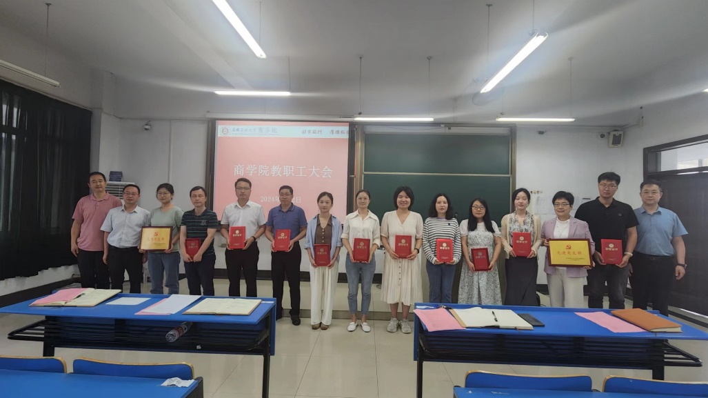 蒋磊宣读了2024年校(院)先进党支部、校(院)优秀教工党员、校(院)优秀常务工作者、校优秀“双带头人”教师党支部书记、院优秀教师党支部书记表彰决定,受表彰的教工党员代表依次上台领奖并合影留念。