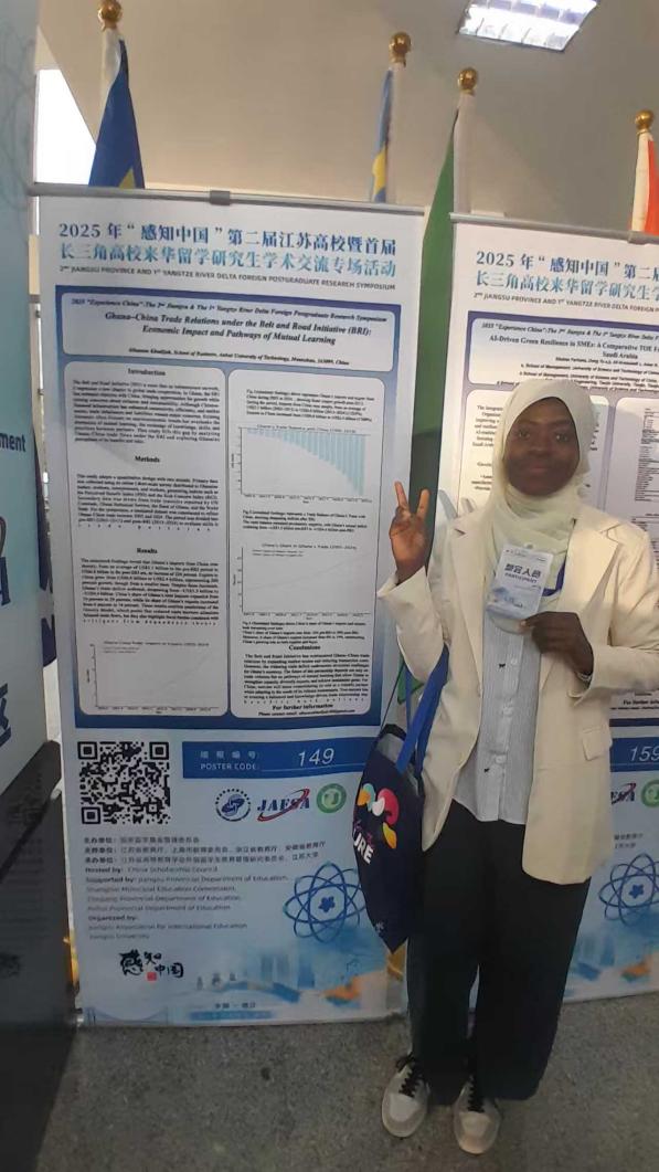 在文法经管分论坛中,Alhassan Khadijah同学围绕国际经济与贸易领域的相关研究成果进行了现场汇报。她的论文聚焦“一带一路”倡议下的中国与加纳贸易合作新趋势,论据充分、逻辑清晰,展现了扎实的专业基础和创新的学术思维,得到了评审专家的一致认可,最终在众多参赛作品中脱颖而出,荣获“优秀奖”。参会期间,Alhassan Khadijah还积极参与墙报展评、专家主旨报告、国际青年学者对话等环节,与来自不同国家和地区的学子交流学术心得、碰撞思想火花,拓宽了国际视野。
