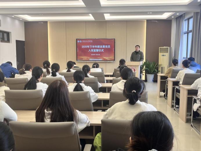 于11月24日举行新发展党员入党宣誓仪式。院党委书记杜飞,院党委副书记、纪委书记、副院长蒋磊,各学生党支部书记、党员代表出席本次活动,2025年下半年新发展的72名党员以及入党积极分子代表参加。仪式由肖梦雨老师主持。