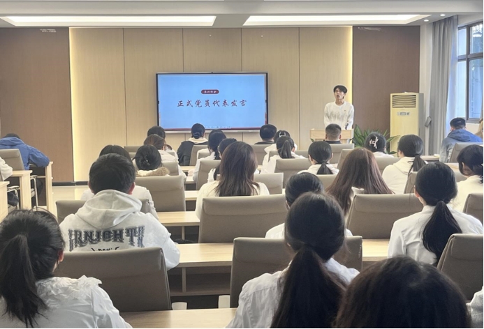 院党委书记杜飞代表学院党委向全体新党员表示热烈祝贺,并提出三点殷切期望:一要持续深化理论学习,深入领会党的二十届四中全会精神,争做全面深化改革的积极先行者;二要严守党的纪律和规矩,筑牢思想防线,成为校园清风正气的坚定维护者;三要自觉对标“强国先锋”的时代要求,勇担使命、奋发有为,成为堪当民族复兴重任的青春奋斗者。他强调,入党誓词是需用一生践行的庄严承诺,全体同志应把个人追求融入党和人民的事业,在新征程中展现青年党员的新风貌。