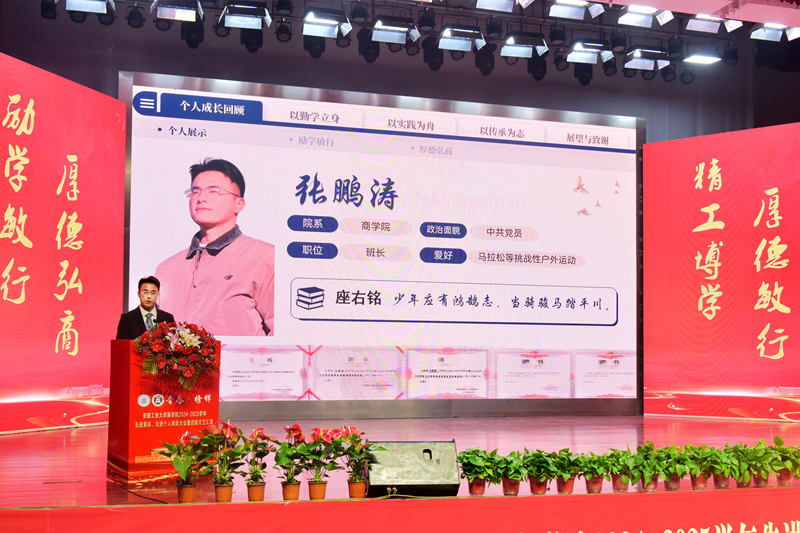 在典型事迹展示环节,校“十佳班级”代表融221班张文静同学讲述了先进班级创建的主要事迹;商221班俞睿达分享了个人在校期间的求知之路;校第28届研究生支教团成员、商222班张鹏涛号召同学们要积极投身实践、服务基层;北京盈科(合肥)律师事务所股权高级合伙人、SKrBT