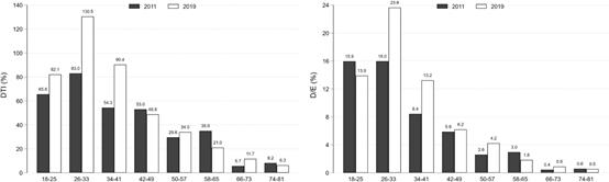 (按年龄组划分的DTI和D/E比率第90和第95百分位的变化)