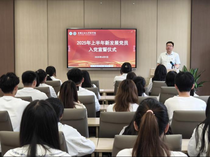为进一步提升大学生党员的党性修养,深化大学生思想政治教育,切实提升学生党员的责任感和使命感,6月9日,商学院党委举行2025年上半年新发展党员入党宣誓仪式。商学院党委书记杜飞,学生党支部书记代表刘长秋、肖梦雨出席本次活动,2025年上半年新发展的80名党员以及毕业生党员、入党积极分子代表参加。仪式由肖梦雨主持。