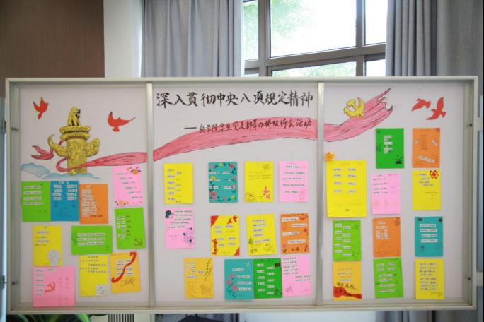 为深入贯彻中央八项规定精神学习教育,加强作风建设,6月13日上午,学院办公室党支部、学生第一、第八、第十、第十一党支部联合举办了“深入贯彻中央八项规定精神学习教育拼贴诗会”主题党日活动,共有来自5个师生支部的党员、积极分子等40余人参加。