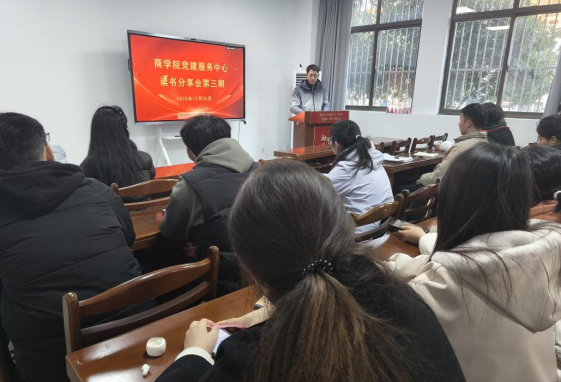 为深入学习贯彻党的二十届四中全会精神,激发青年党员理论学习热情,商学院党建服务中心于12月26日在汇文楼B114室举行了第三期“红心铸魂· 读书会”活动。本期活动以“青春心向党奋斗正当时——新时代青年党员的使命与担当”为主题,旨在通过研读红色经典与时代文献,引导青年党员深刻认识历史使命与时代责任。学院党建服务中心徐韬老师、第十三至十七党支部师生党员代表共40余人参加活动。