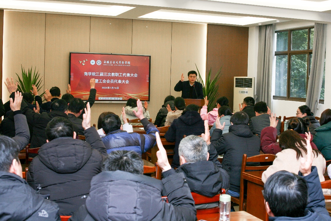 1月16日,安徽工业大学商学院三届三次教代会暨工代会在汇文楼B204隆重召开。院党政领导、全体正式代表及列席代表参加会议,会议由院党委副书记、院纪委书记、副院长蒋磊主持。
