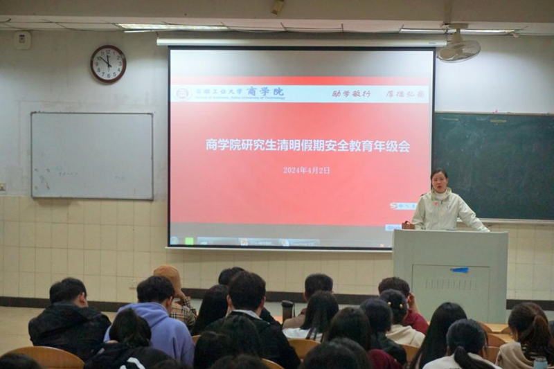 4月2日晚上,商学院在秀山校区东教一阶101召开研究生清明假期安全教育年级会,研究生辅导员和各年级研究生参加了此次会议。会议由辅导员郝乐老师主持。