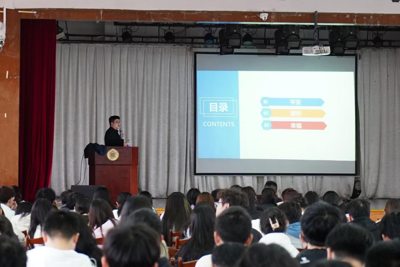 在“平安”方面,他强调了消息畅通的重要性,倡导文明聚餐并特别提醒同学们注意租房安全、晚就寝零汇报安全、防范网络电信诈骗,以及宿舍安全,特别是禁用违规电器,确保校园生活的和谐稳定。在“顺利”方面,蒋磊着重讲解了学业成绩和二课成绩的重要性,以及体测成绩纳入评奖评优机制的新变化,鼓励同学们全面发展,努力提升自己的综合素质,为未来的职业发展打下坚实的基础。最后,在“幸福”方面,蒋磊为同学们分析了当前的就业形势,同时也介绍了商学院近年来的考研升学情况,具体分析了2020届毕业生升学率提高的原因和做法。他结合多年就业指导经验,针对考研学子普遍存在的困惑,从研究生学科分类、研究生资助体系、未来职业规划等多个维度对本科生升学、就业去向及其发展进行深入剖析,为同学们提供了详细的考研指导和建议,鼓励他们坚定信念,合理规划学习目标。